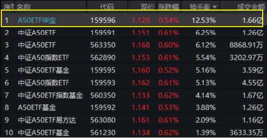 场内代表性A50ETF华宝(159596)全天飘红,场内价格收涨0.54%,放量成交1.66亿元,换手率12.53%,断层领先全市场所有A50ETF!