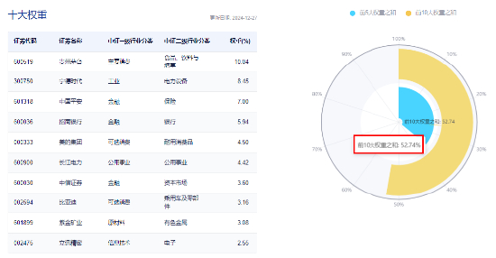 配置工具上,把握大盘蓝筹机遇,建议关注A股“漂亮50”——中证A50指数,相关ETF关注A50ETF华宝(159596)。中证A50成份股平均自由流通市值1667亿元,大盘龙头风格突出。前十大成份股合计权重近53%,集中度较高,因此整体弹性较大,在核心资产牛市中有望获取更佳表现。(数据来源于中证指数公司,截至2024.12.27)