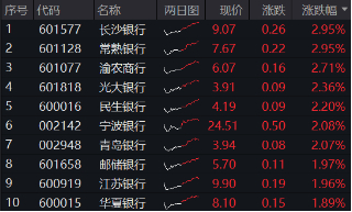 个股方面,42只银行股40涨2平,29股涨逾1%,城农商行表现较强,长沙银行、常熟银行双双涨近3%,渝农商行、光大银行、民生银行等跟涨居前。值得注意的是,继上周国有四大行连创历史新高,江苏银行、上海银行盘中股价亦刷新新高!