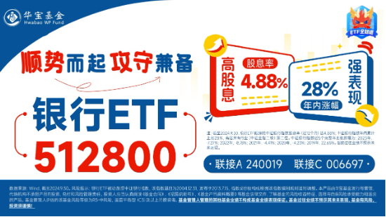 风险提示:银行ETF被动跟踪中证银行指数,该指数基日为2004.12.31,发布于2013.7.15;800红利低波ETF被动跟踪中证800红利低波动指数,该指数基日为2013.12.31,发布日期为2024.5.21;标普红利ETF被动跟踪标普A股红利指数 (CSPSADRP),该指数基日为2004.6.18,发布日期为2008.9.11;券商ETF被动跟踪中证全指证券公司指数,该指数基日为2007.6.29,发布于2013.7.15;金融科技ETF被动跟踪中证金融科技主题指数,该指数基日为2014.6.30,发布日期为2017.6.22;中证A500ETF华宝被动跟踪中证A500指数,该指数基日为2004.12.31,发布于2024.9.23;中证A100ETF基金标的指数为中证A100指数,该指数基日为2005.12.30,发布日期为2006.5.29;A50ETF华宝标的指数为中证A50指数,该指数基日为2014.12.31,发布日期为2024.1.2。指数成份股构成根据该指数编制规则适时调整,其回测历史业绩不预示指数未来表现。文中提及个股仅为指数成份股客观展示列举,不作为任何个股推荐,不代表基金管理人和基金投资方向。任何在本文出现的信息(包括但不限于个股、评论、预测、图表、指标、理论、任何形式的表述等)均只作为参考,投资人须对任何自主决定的投资行为负责。另,本文中的任何观点、分析及预测不构成对阅读者任何形式的投资建议,本公司亦不对因使用本文内容所引发的直接或间接损失负任何责任。投资人应当认真阅读《基金合同》、《招募说明书》、《基金产品资料概要》等基金法律文件,了解基金的风险收益特征,选择与自身风险承受能力相适应的产品。基金的过往业绩并不预示其未来表现,基金管理人管理的其他基金的业绩并不构成基金业绩表现的保证。根据基金管理人的评估,银行ETF(512800)、800红利低波ETF(159355)、标普红利ETF(562060)、券商ETF(512000)、金融科技ETF(159851)、中证A500ETF华宝(563500)、中证A100ETF基金(562000)、A50ETF华宝(159596)风险等级均为R3-中风险,适宜平衡型(C3)及以上的投资者,适当性匹配意见请以销售机构为准。销售机构(包括基金管理人直销机构和其他销售机构)根据相关法律法规对以上基金进行风险评价,投资者应及时关注基金管理人出具的适当性意见,各销售机构关于适当性的意见不必然一致,且基金销售机构所出具的基金产品风险等级评价结果不得低于基金管理人作出的风险等级评价结果。基金合同中关于基金风险收益特征与基金风险等级因考虑因素不同而存在差异。投资者应了解基金的风险收益情况,结合自身投资目的、期限、投资经验及风险承受能力谨慎选择基金产品并自行承担风险。中国证监会对以上基金的注册,并不表明其对该基金的投资价值、市场前景和收益做出实质性判断或保证。基金投资须谨慎。