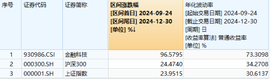 来源:Wind,统计区间2024.9.24-2024.12.30。中证金融科技主题指数2019-2023年年度涨跌幅分别为:48.18%、10.46%、7.16%、-21.40%、10.03%。指数成份股构成根据该指数编制规则适时调整,其回测历史业绩不预示指数未来表现。