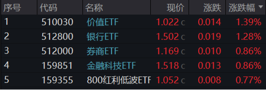 盘面上,红利资产年末重回C位,上周银行领涨两市,中证银行指数区间(12月23日~27日)累计上涨3.88%,高居所有行业(中证全指二级)首位,国有四大行连创多个历史新高。今日银行股再度普涨,A股顶流银行ETF(512800)场内放量续涨逾1%,日线强势6连阳。煤炭、石油石化等亦有较好表现,800红利低波ETF(159355)、标普红利ETF(562060)两只红利主题ETF场内分别收涨0.77%、0.36%。