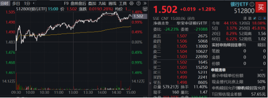继上周领涨两市,今日银行股继续走强,A股顶流银行ETF(512800)早盘低开后迅速拉升,午后涨幅进一步扩大,场内价格收涨1.28%,日线强势6连阳,全天成交额8.65亿元,环比放量。