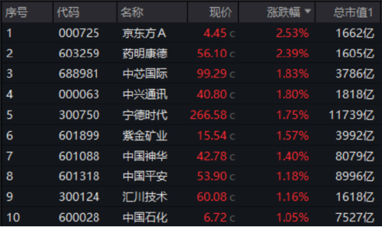 具体看“漂亮50”龙头股表现,京东方A、药明康德涨超2%居前,中芯国际、中兴通讯涨逾1.8%,核心权重股宁德时代大涨1.75%,贵州茅台小幅收跌0.26%。