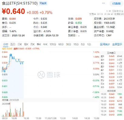 今日(12月31日),吃喝板块开盘后迅速冲高,反映吃喝板块整体走势的食品ETF(515710)盘中场内价格最高涨幅达到1.42%,后略有回落,截至10:25,涨0.79%。