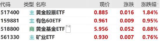 有色板块今日逆市上涨。有色60ETF(159881)、矿业ETF(561330)均涨超0.7%。黄金股票ETF(517400)涨1.84%,黄金基金ETF(518800)涨0.88%。