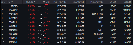 具体来看,稀土方面,广晟有色涨停封板,中国稀土、盛和资源涨超3%;铅锌方面,株治集团涨超4%,国城矿业涨逾2%;锂方面,赣锋锂业、天齐锂业涨超2%。