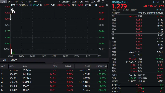 热门ETF方面,反弹急先锋——金融科技ETF(159851)大幅冲高,场内价格一度涨近2%,实时成交额快速突破81000万元!