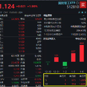 值得关注的是,此前国防军工ETF(512810)连续调整区间,已有资金逢跌埋伏。数据显示,截至1月6日,国防军工ETF(512810)近5个交易日吸金675万元,近10日累计吸金914万元。