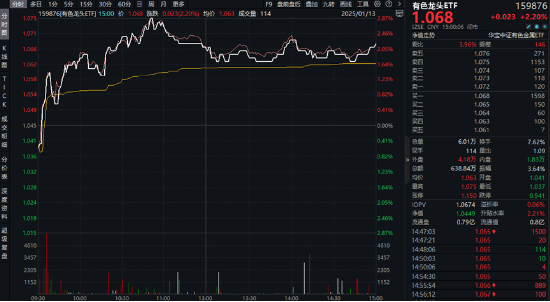 热门ETF方面,被动跟踪中证有色金属指数的有色龙头ETF(159876)早盘快速冲高后,全天维持高位,场内价格最高上探2.87%,收涨2.2%。