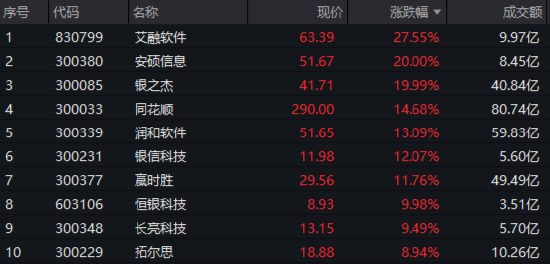 今日金融科技全线爆发,板块涨幅领涨市场,中证金融科技主题指数收涨8.71%,成份股多股大涨!艾融软件大涨超27%逼近涨停,安硕信息、银之杰20CM封板,恒银科技二连板,同花顺、银之杰、银信科技、赢时胜等多股跟涨超11%,市场热门个股东方财富涨超7%,成交额达204亿元登顶全市场股票成交额第一。