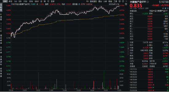 热门ETF方面,专注数据科技领域的大数据产业ETF(516700)全天震荡攀升,场内价格飙涨5.7%,收于日内高点,一举收复5日、10日均线。