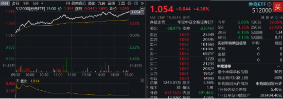 A股顶流券商ETF(512000)高开高走,全天单边向上,尾盘进一步拉升,场内价格收涨4.36%,单日成交额12.92亿元,环比放量126.27%,显示板块交投情绪显著升温。