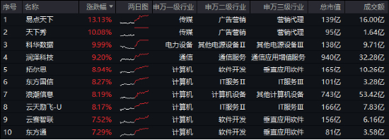 2025年开年以来,大数据产业方向重磅政策迭出,今日,数据科技方向蓄势高飞,中证数据指数50只成份股全部涨超3%,29只个股涨逾5%。其中,小红书概念股天下秀涨停,受益于华为“算电协同”概念,科华数据封板,易点天下涨超13%,润泽科技涨逾9%,拓尔思、东方国信、浪潮信息、云天励飞-U携手涨超8%。