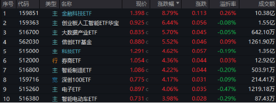 暴涨!“科技+金融”双牛齐驱,金融科技ETF(159851)爆量拉升8.79%,券商股狂飙!创业板人工智能强势反弹