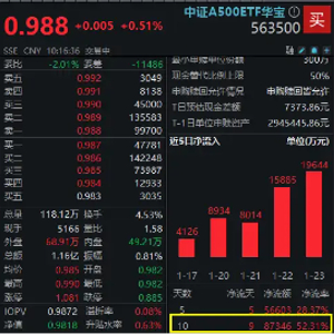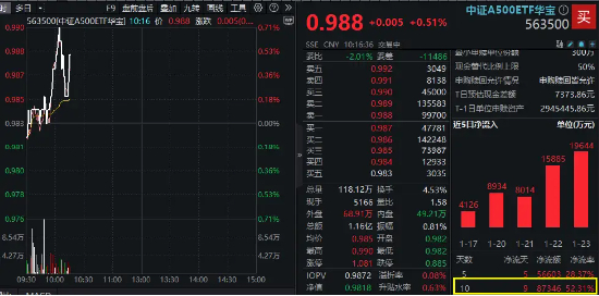 全市场唯一尾号500中证A500ETF华宝(563500)小幅低开后快速拉升翻红,实时成交额超1亿元。近期资金加仓意愿浓厚,截至1月23日,该ETF近10个交易日累计申赎净流入超8.73亿元