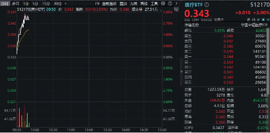 场内热门ETF方面,A股顶流医疗ETF(512170)开盘后直线冲高,截至发稿涨3%!场内交投高度活跃,成交额快速突破4亿元