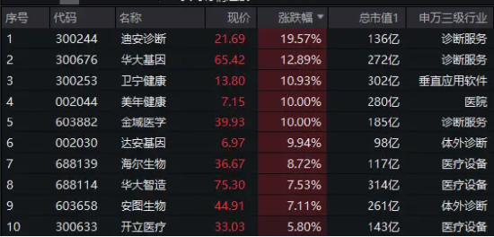 成份股方面,AI医疗概念股仍是主力!迪安诊断冲击20CM连板,华大基因、卫宁健康涨超10%,美年健康、达安基因、金域医学集体涨停,分别录得7日5板、2连板、7日4板!