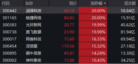 大数据产业方向势如破竹,一站布局数据要素全产业链的中证数据指数50只成份股中,11只个股涨停封板,其中,润泽科技、光环新网、奥飞数据3股20CM涨停,云赛智联、拓维信息、紫光股份、宝信软件、科华数据、数据港、神州信息、盛视科技8股10CM封板。