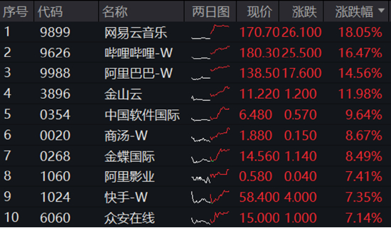 港股科网股全线沸腾,网易系、哔哩哔哩、阿里系绩后携手领涨,阿里巴巴涨逾14%,创出逾3年新高,单日成交额444.58亿元,为历史天量;网易云音乐、哔哩哔哩-W、金山云均收获两位数涨幅,快手涨逾7%,腾讯控股涨超6%,小米集团涨超5%。