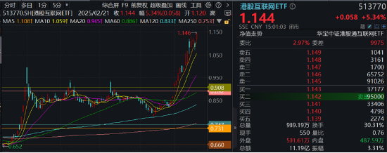 热门ETF方面,重仓港股互联网龙头的港股互联网ETF(513770)高开高走,午后进一步攀升,场内价格收涨5.34%,再刷历史新高,全天成交额11.19亿元。