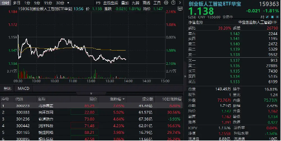 热门ETF方面,全市场首只的创业板人工智能ETF华宝(159363)震荡走低场内下跌逾1.5%,实时换手率超16%,成交额达1.71亿元,交投活跃。盘中频现溢价交易,表明买盘活跃,或有资金逢低介入。