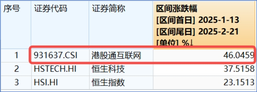 值得一提的是,此前港股科网板块持续上攻,截至2月21日,港股互联网ETF(513770)跟踪的中证港股通互联网指数近6周以来(1.13~2.21)累计涨幅更是高达46.05%,显著优于恒指、恒科指同期表现,领涨弹性突出。