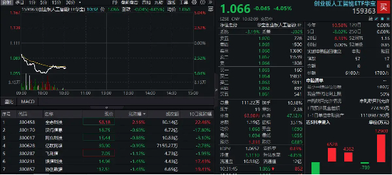 热门ETF方面,全市场首只的创业板人工智能ETF华宝(159363)开盘走低,场内价格一度下探5%,实时成交额快速突破1亿元,盘中持续溢价交易,或有资金继续低位布局。