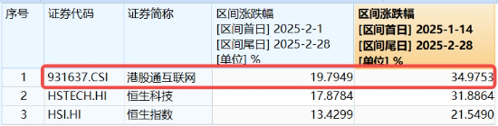 投资港股AI核心资产,认准港股通互联网指数。数据显示,自1月14日行情启动以来至2月28日,恒指、恒科指单月分别累计上涨21.55%、31.89%,而港股通互联网指数累计涨幅高达34.98%,弹性突出,是追踪本轮港股科网牛的高效率投资工具。