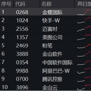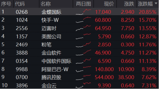 此外,腾讯控股涨超7%,哔哩哔哩-W涨超6%,美团-W涨超5%,小米集团-W跟涨逾1%,金蝶国际、快手-W、美图公司等7股喜提两位数涨幅。