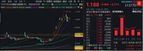 热门ETF方面,重仓港股互联网龙头的港股互联网ETF(513770)早盘跳空高开,场内价格飙涨6.17%,再创上市以来新高,全天成交额11.68亿元。