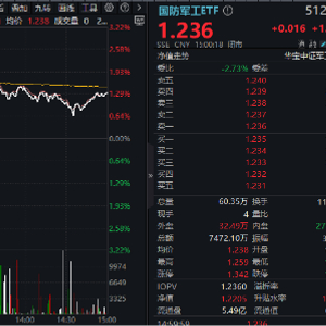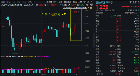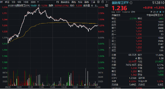3月7日,国防军工板块逆市活跃,早盘一度领跑全市场。场内热门国防军工ETF(512810)盘初拔地而起,直线冲高3.2%!而后震荡回落,场内逆市收涨1.31%报1.236元,创年内新高!全天成交7472万元,较前一日放量逾千万元。