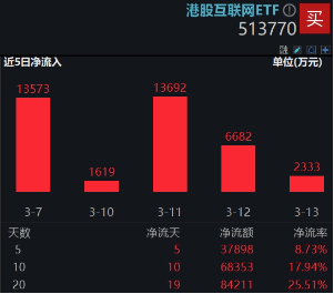 伴随着行情演绎,港股互联网ETF(513770)也吸引了资金的热切关注。上交所数据显示,港股互联网ETF(513770)近20日有19日获资金增仓,累计净流入8.42亿元。