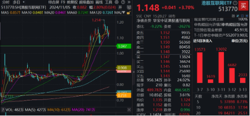 重仓港股互联网龙头的港股互联网ETF(513770)高开高走,场内价格一度涨逾4%,收涨3.7%,一举收复5日、10日、20日均线,重回所有均线上方,全天成交额10.85亿元。