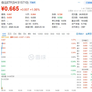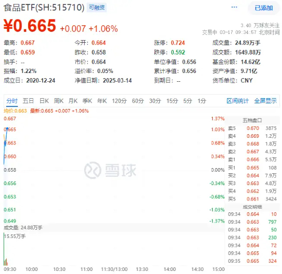 今日(3月17日),吃喝板块继续走强,反映吃喝板块整体走势的食品ETF(515710)场内价格最高涨幅达到1.36%,截至9:34,涨1.06%。