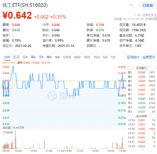 今日(3月17日),大盘震荡盘整,部分化工细分板块表现亮眼。反映化工板块整体走势的化工ETF(516020)几乎全天红盘震荡,盘中场内价格最高涨0.63%,截至收盘,涨0.31%。