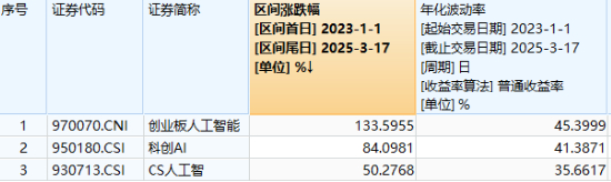 来源:Wind,统计区间2023.1.1-2025.3.17。创业板人工智能ETF被动跟踪创业板人工智能指数,该指数基日为2018.12.28,发布日期为2024.7.11。创业板人工智能指数2020-2024年年度涨跌幅分别为:20.1%、17.57%、-34.52%、47.83%、38.44%,指数成份股构成根据该指数编制规则适时调整,其回测历史业绩不预示指数未来表现。