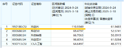 3、更高弹:科创板人工智能指数自9.24行情以来,累计上涨110.59%,大幅跑赢科创50(69.48%)、科创综指(66.71%)等科创板宽基指数,以及科创芯片(98.41%)等细分行业指数和中证人工智能主题指数(64.65%)等同类人工智能指数。