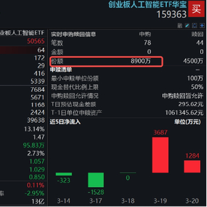 热门ETF方面,全市场首只的创业板人工智能ETF华宝(159363)全天震荡走低,场内价格收跌3.1%,日线三连阴。全天换手率超13%,成交额达1.79亿元,环比放量明显。资金逢跌布局,全天净申购达4400万份,表明积极看多后市AI行情!