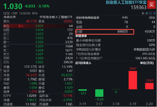盘面上,市场情绪低迷,资金涌入防御板块避险,仅钢铁、石油石化两个板块(申万一级)收红,人形机器人、消费电子、算力等热门题材领跌。创业板人工智能ETF华宝(159363)场内价格跌逾3%,日线三连阴。资金逢跌布局,全天净申购达4400万份!