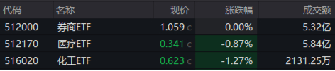盘面无明显主线,热门题材集体哑火。化工板块领跌,化工ETF(516020)场内跌1.27%。CXO掉头向下,引发医药医疗冲高回落,医疗ETF(512170)场内跌0.87%。券商板块午后一度直线拉升翻红,终究难敌抛压,券商ETF(512000)平盘报收。