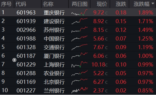板块个股多数收红,国有大行整体表现较强,建设银行、中国银行、交通银行均涨逾1%,此外,重庆银行、苏州银河、厦门银行等涨幅居前。