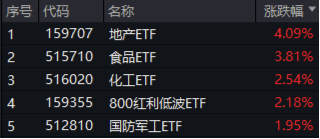 盘面上,随着A股反关税情绪持续发酵,内需题材应声爆发。机构表示房地产止跌回稳对于内需发力意义重大,地产ETF(159707)全天强势,尾盘继续走高场内劲涨4.09%;或受茅台再抛回购计划等因素影响,吃喝板块全天单边上扬,反映吃喝板块整体走势的食品ETF(515710)场内价格大涨3.81%;高股息方向备受青睐,红利低波资产表现不俗,800红利低波ETF(159355)场内价格收涨2.18%。