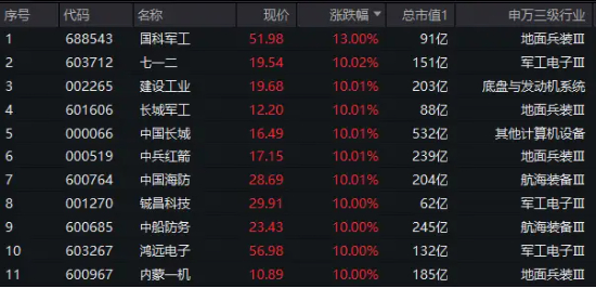 国防军工ETF(512810)覆盖的80只龙头股全部飘红,中国长城、中兵红箭、中船防务、中国海防、长城军工、铖昌科技、内蒙一机、鸿远电子、七一二、建设工业等10股涨停封板,国科军工一度冲击20CM,午间收涨13%。