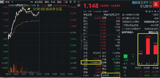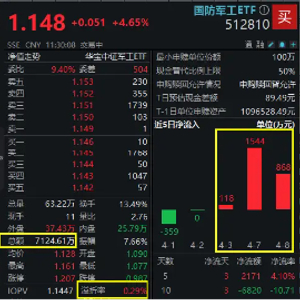 关税扰动下,国防军工“抗跌”基因觉醒,9日早盘一举冲破情绪“阴霾”,逆市领涨全市场!行业代表性国防军工ETF(512810)放量摸高5.83%,午间收涨4.65%,溢价率0.29%,显示买盘资金尤为强势!半日成交超7124万元,已大幅超越昨日全天成交额。