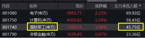 主力资金嗅觉灵敏,火速涌入国防军工板块抢筹,半日净买入45.75亿元,在31个申万一级行业中高居第三。个股方面,中兵红箭、中国船舶、中船防务等主力净流入额居前。