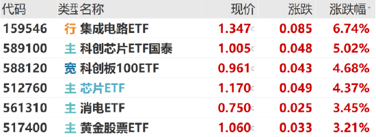 今日科技板块大涨,集成电路ETF(159546)涨6.74%,科创芯片ETF(589100)涨5.02%,科创板100ETF(588120)、芯片ETF(512760)均涨超4%。