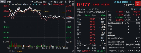 场内热门的港股互联网ETF(513770)延续连日来的上涨势头,场内价格一度涨逾2%,收涨0.62%,全天成交额6.29亿元。