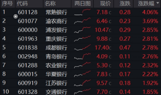 今日银行板块全天逆市走强,A股42只上市银行超9成收涨,整体涨幅中位数达1.24%,显著优于大盘。具体看,城农商行表现较强,常熟银行领涨逾4%,渝农商行涨超3%,浦发银行、重庆银行、成都银行、农业银行等6股涨超2%。