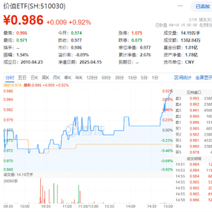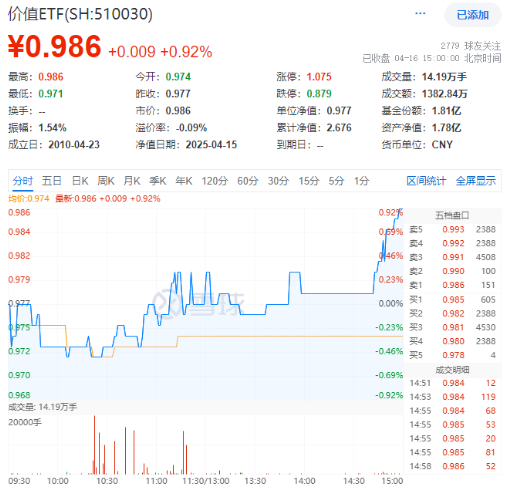 今日(4月16日),大盘几乎全天低位震荡,尾盘奇迹拉升,高股息方向表现尤为亮眼。聚焦“高股息+低估值”大盘蓝筹股的价值ETF(510030)场内价格收涨0.92%。